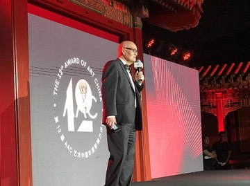 雅昌文化集团总裁万捷、故宫博物院院长单霁翔与郑聖天给年度艺术家陈界仁颁奖