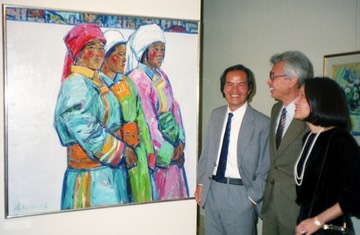 蔡文颖、张培莉夫妇在看郑胜天的油画《盛装》