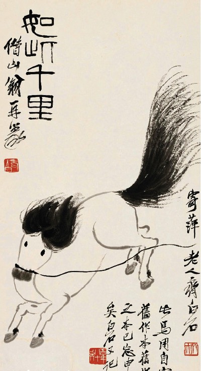 可是齐白石画过马吗?我也纳闷自己是否孤陋寡闻。在网上遍搜一遭之后,终于找到一幅《如行千里图》。虽然马的结构比例按西画观点未必十分准确,但区区几笔淡墨的勾勒,和他的鱼虾同样活灵活现。难怪当年的卡斯塔尼诺他们也会膛目结舌,看得津津有味呢!